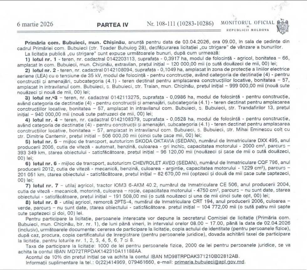 Primăria com. Bubuieci, mun. Chișinău, anunță pentru data de 03.04.2026, ora 09.00, în sala de ședințe din cadrul Primăriei com. Bubuieci (str. Toader Bubuiog 28), desfășurarea licitației „cu strigare” de vânzare a bunurilor.